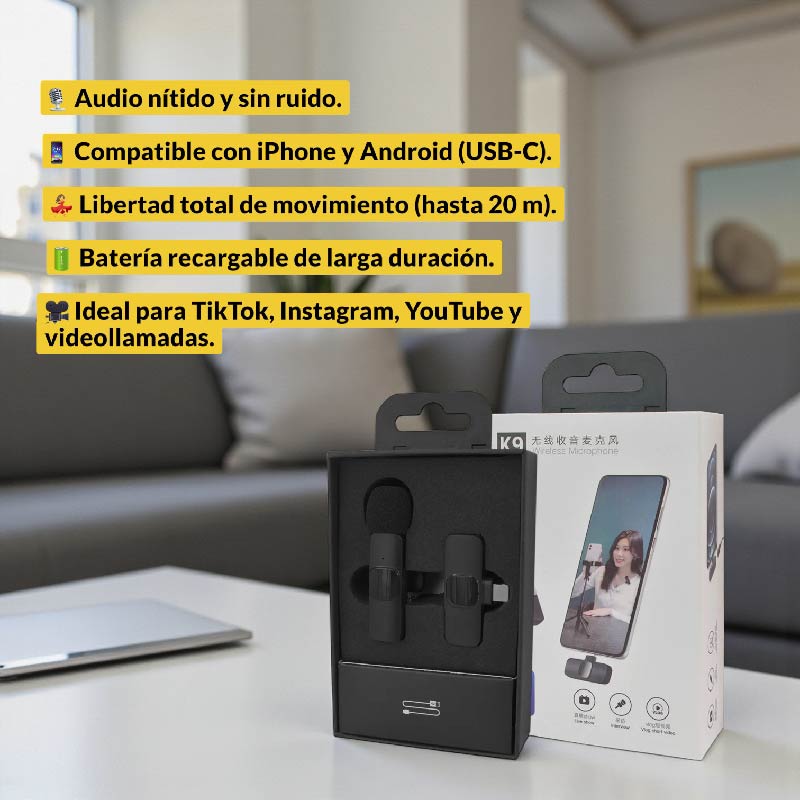 El micrófono inalámbrico K9 te da la libertad de moverte, hablar y crear contenido con calidad de estudio. Ideal para lives, entrevistas, rutinas fitness, reseñas de maquillaje o reuniones de trabajo.