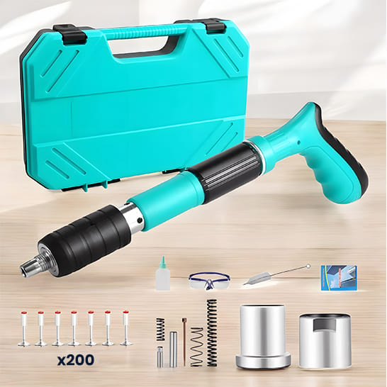 🛠 Ajuste de potencia: 5 niveles para fijaciones en distintos materiales. ⚡ Velocidad sin igual: Clava en acero en 0.1 segundos. ✨ Versatilidad extrema: Perfecta para cámaras, estanterías, tuberías y más. 🧤 Seguridad garantizada: Incluye guantes, gafas y tapones para los oídos.